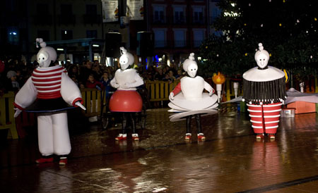 Cuatro grandes juguetes mecánicos pasean por la calle, sorprendiéndose con todo aquello que encuentran. La propuesta, a lo largo de la itinerancia del espectáculo, combina el trabajo coral de los cuatro personajes, a modo de carrillón ambulante, el trabajo de improvisación de los personajes con el público y los movimientos coreográficos de ocupación espacial.